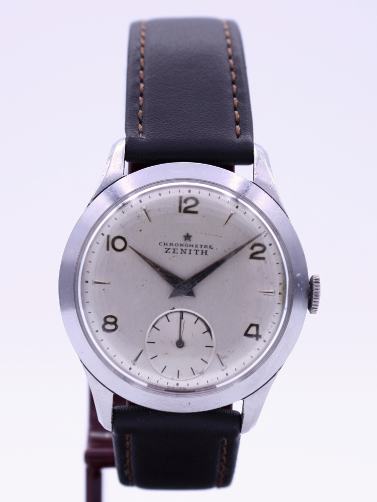 ZENITH caliber 135 in beautiful steel case. The dial and movement are both signed chronometer. Caliber 135 is known among collectors as the best manual winded movement ever made. The watch is in very good condition and comes with original crown. The movement is completely serviced by our professional watchmakers. Case no. 9047930. Movement no. 4217630