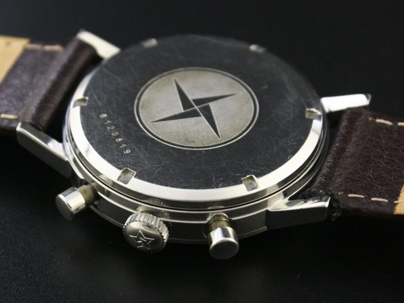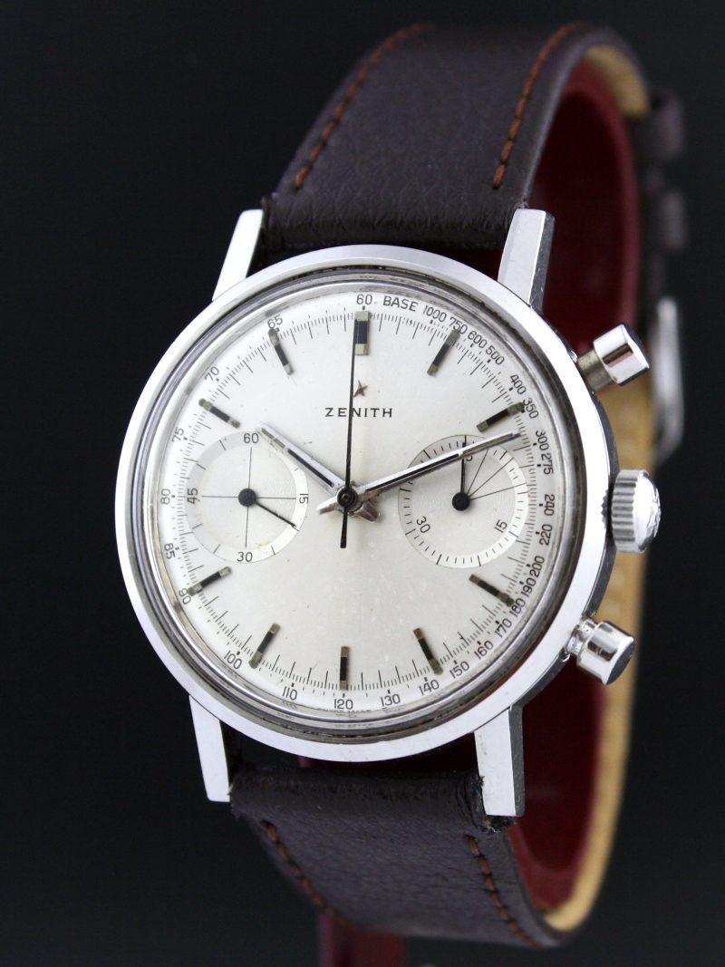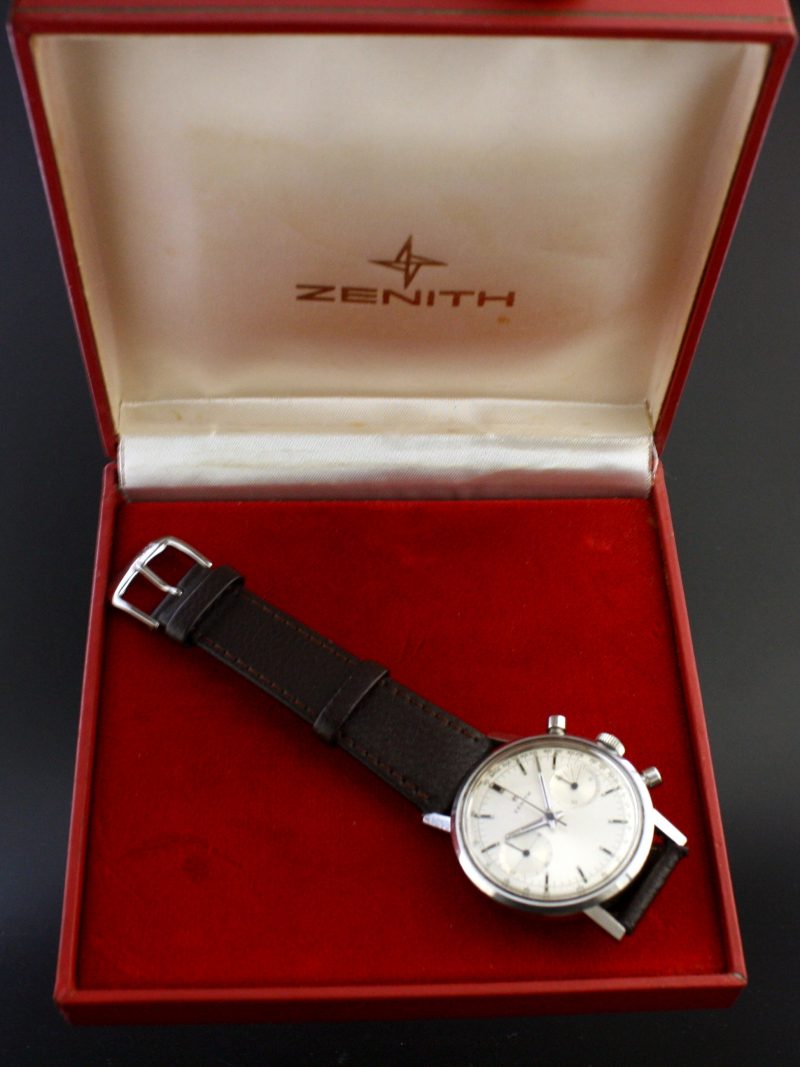 ZENITH 146 DP around the year 1960 has a manual winded chronograph movement. It has a robust steel case that measures 37 mm in diameter. The dial is equipped with a tachymeter scale and 2 registers. The watch comes with original Zenith buckle, crown and box. In short, a great watch with a stunning movement.