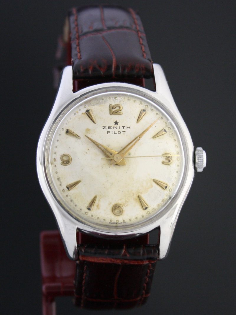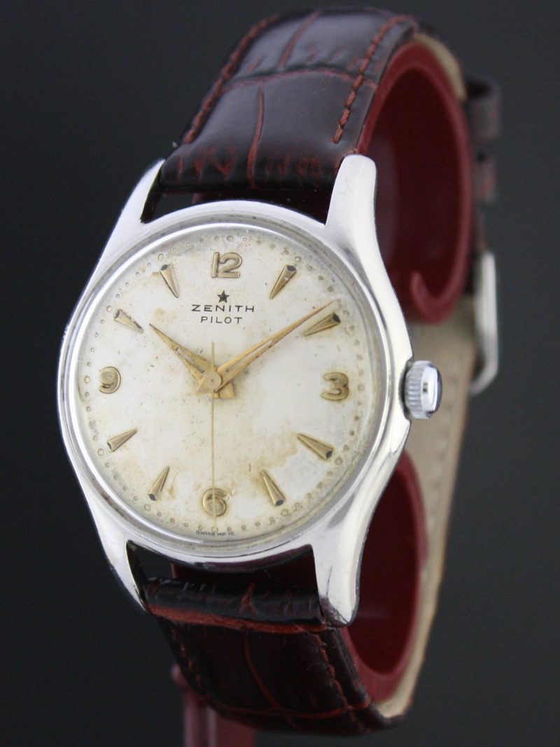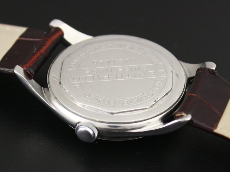 ZENITH maunal winded watch with caliber 120 inside. Caliber 120 features the famous secondsstop mechanism, this means that the watch stops running when the crown is pulled out. This mechanism was used by pilots to adjust the time exactly. Naturally the movement was recently serviced by us. The watch in beautiful steel case comes with it’s original crown.